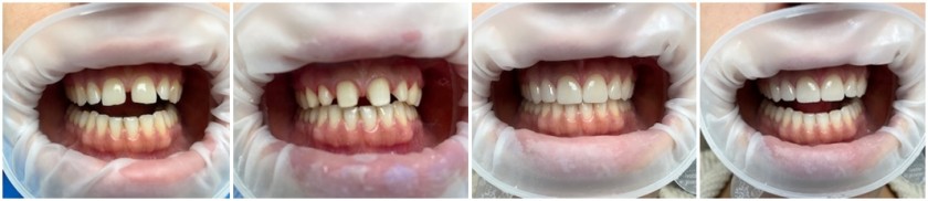 - Anschließend erfolgte die Versorgung mit provisorischen Zahnkronen (2. von rechts).